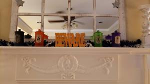 Glittery cheap boas from grocery stores. I have ones with pumpkins, one with ghosts, and one with witches. They take up a space so nicely. You can see parts of this one behind other decorations on the mantle. They’re also good for long tables, entertainment hutches, and wrapping around banisters.