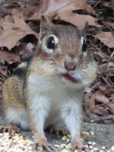I called, “Chippy, slow down.” And he stopped and looked at me. One side of his cheek pouch is filled with seeds: the darn chipmunk.