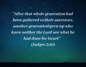 All it took for God’s people to fall away was for one generation to miss passing on their faith. Like the Olympic torch, if one person allows the torch to go out, the flame is extinguished. The same is true with our faith. If we neglect to teach our children and those the Lord places in our path, the next generation will suffer the fate. We as Christians must be diligent in sharing our faith and living it out on a daily basis.