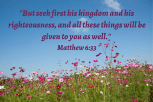 So, I thought it was time I take a closer look at the verse. I knew I needed to seek first God’s kingdom, but what was Jesus referring to when He said “these things” would be given as well? To find out, I referred to the previous verses where Jesus talks about how God cares for the birds and how beautifully he has clothed the flowers. But it was verse 31 that really hit me: