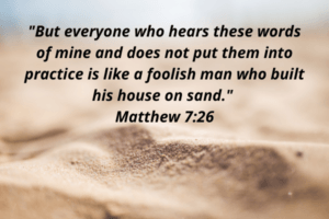 But what differed was WHERE the men built. The foolish man skimped by building on a site that wasn’t suitable or secure (sand). So when the wind blew and the storms came, over time, the foolish man’s house began to shift and crumble. The wise man, on the other hand, built on firm, level rock that held strong against the onslaught of storms.