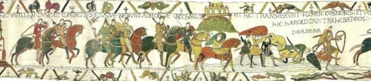 Bayeux Tapestry Scenes 16 and 17: William and Harold at Mont-Saint-Michel (at top centre); Harold rescuing knights from quicksand. By Soerfm – Public Domain, https://commons.wikimedia.org/w/index.php?curid=31051585