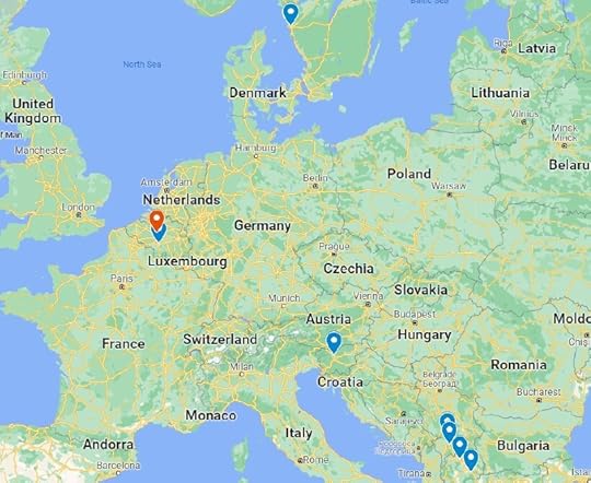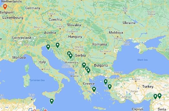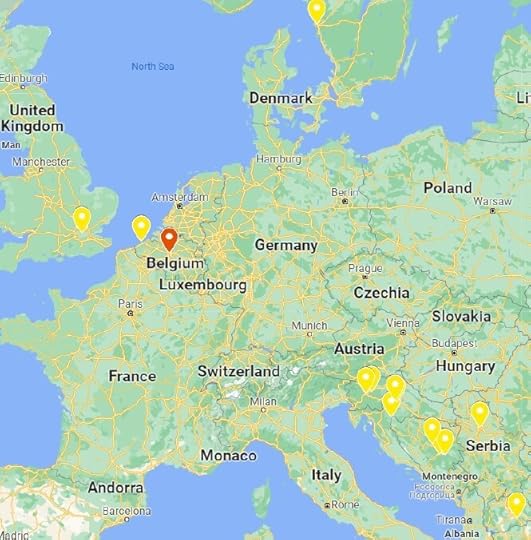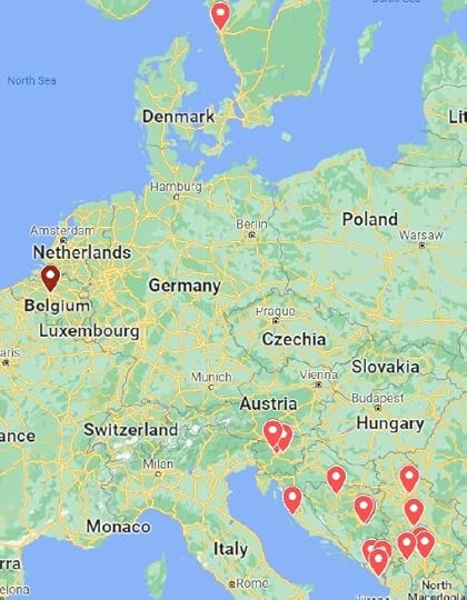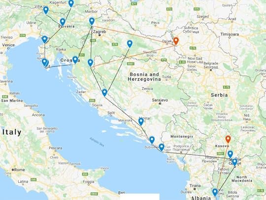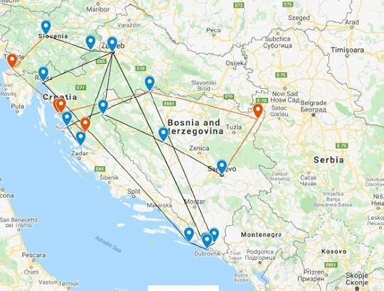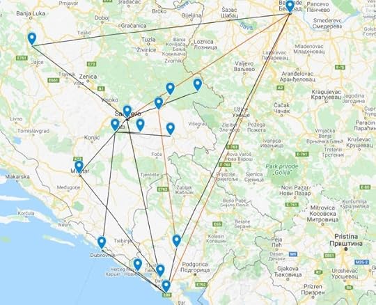 Legend: I used blue pins and black lines for the locations where major events in the novels occurred to the main protagonists and black lines to connect them. I used red pins and lines for Predrag’s location when it was substantially different from the rest of the characters (including the ‘hunting trip’ he takes with one of the other characters in book three). Zlatko’s location isn’t included.