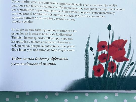 En Lo que nos hace únicos se habla de niños que se escapan de lo normativo. De diversidad sexual. De diversidad de tamaños. De discapacidad. De niños con inquietudes. De todas esas cosas que en algún momento han sido motivo de bullying. Y las pone en valor. A través de pequeños textos en verso habla de la belleza de esas cosas y porqué nunca deberían ser motivo de burla.