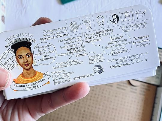 Si os fijáis todas las fichas cuentan en su parte superior con una serie de símbolos que nos explican porqué esta persona es importante. En el caso de Chimamanda Adichie sabemos que es escritora, activista, defensora de los derechos de las mujeres, que lucha contra el racismo, que emigró y que está comprometida con la educación. Eso lo vemos en los símbolos. Pero las fichas también nos cuentan más cosas y podemos saber por ejemplo que ella está viva.