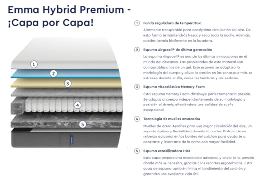 El nuevo colchón Emma Hybrid Premium cuenta con un montón de capas, como cuentan en su web oficial. Posiblemente entendáis tanto de capas de material de colchones tanto como yo así que os dejo aquí la foto que las detalla por culturilla general y pasamos a lo que realmente importa ¿Pero esto es cómodo de verdad de la buena?