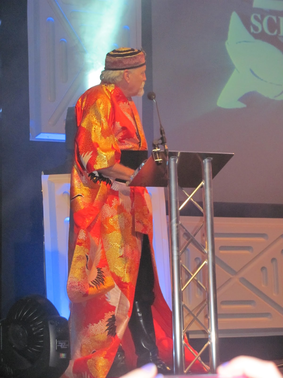 This was one of the funniest and most enjoyable award ceremonies I've ever been to. Made so, without doubt, by the marvellous Robert Rankin and his gorgeous wife Raygun. The evening opened with some of the lovely girls who had been on stilts all weekend doing a fantastic, upbeat dance number. Then Robert and Raygun were escorted through the audience by Darth Vader and his evil Storm Troopers, some of whom were covered in red bloodstains so had obviously been up to no good before the evening started. Robert was wearing a stunning Emperic Kimono and Raygun, sadly, had to carry his train. It was a magnificent entrance and not having been to the SFX Weekender before I didn't realise what a brilliant double act Robert and Raygun are.The awards began, much humour ensued. To see the full results then click HERE. Some highlights of the video acceptances: Neil Gaiman - not only is he a genius but he also has a keen sense of humour. Is it me or does George RR Martin look like Captain Bird's Eye? Stan Lee - a legend. Complete legend. It was great to see Brian Aldiss receive the much deserved award for Outstanding Literary Contribution, and smashing that he was actually present. So many of the other winners could not attend for varying reasons.