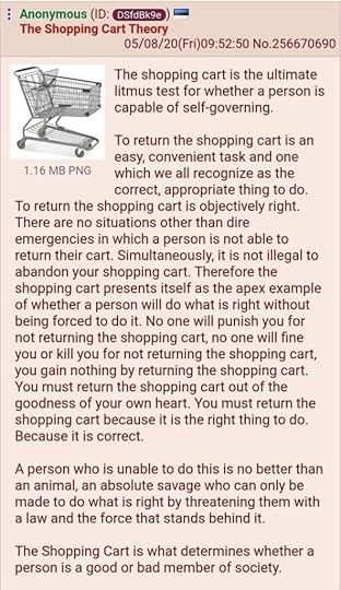 Shopping Cart Theory greentextWhen I first came across this green text I thought, “Well, that makes some sense.” But it seemed too easy. The theory doesn’t account for people who are physically disabled and who may struggle to return their cart. I’ve also heard excuses like, “Well I should leave it out in the parking lot because I’m creating jobs and creating jobs for like the cart runners.” Not true. Clerks or shelf stockers return them. I know, because I did it when I worked at Lowe’s.