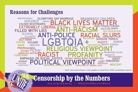 From the American Library Association (ALA). Censorship by the Numbers, from the 2020 Censorship Reports. The ALA puts out free resources for anyone to use and spearheads Banned Books Week. They have tons of cool information on their site if you want to check out more.The experiences in these books can clarify things teenagers have always known to be true, but could not articulate to themselves. For those who have already experienced what is in those books, not seeing their experiences reflected is like being invisible. How do you move forward when your innocence is lost? How do you live when you never got to be innocent? How can teenagers answer the question, “Who and how will I be?” unless they have books that show the consequences for choosing one path or the other?