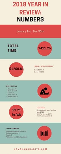 WritingContinue writing 3 pages a day. Gotta keep doing what works. Continue practicing self-editing. Ditto. But, rather than practice self-editing on blog posts, I’ll do it for fiction. Write or do writing-related work 36 hours a week. Stretch goal: 40. This is adjusting for my new job hours. I won’t know how the future will change or how my priorities will change on a month to month basis, but as long as I make time to write and do everything to support it, I’ll be okay. Type up 6 pages from old notebooks per day. When finished, keep no more than one notebook untyped. I write first drafts longhand (if you haven’t guessed by the name of the website). Unfortunately, sometimes I don’t have time to type up my notebooks, and they accumulate, pushing back my ability to edit and polish my work in a timely fashion. I’m struggling to pare down my backlog now. So this year, I’ll work on keeping everything updated.PublishingPost on blog at least twice a month. Yeah, I know. It’s not enough for a blog. But it’s not going to be a priority this year. Begin working with editors, cover designers, and formatters on a novel-length story. Stretch goal: self-publish a novel by the end of the year. Self-published authors will point out that publishing frequently is better. I doubt I’ll self-publish more than one novel than one this year, due to the expense of hiring someone to do cover art and print formatting, unless I break even on the first novel. Publish three works, either self-publish or in magazines, or submit at least to 25 different places. I’m kicking myself for only self-publishing one short story this year. Next year, I want to push for getting my work out, either self-publishing or through literary mags. I still write literary fiction and creative nonfiction essays, and I want to place those in homes that suit them. Set marketing goals. I asked for Harvard Business Review books for Christmas, and I’ll refine my marketing strategy after I read them.Set sales goals. Again, I’ll have to set them after I do more research. Tentatively, I’d like to make back through sales what I spend on editing, formatting, cover design, submission fees, etc. Though, I’m taking the long view in self-publishing, and I imagine it will take years to be solvent.Closing ThoughtsI’d love to say that this all is due to my work ethic and smarts, but writing 36 hours a week and spending over $1,000 on this writing dream wouldn’t have been possible without my parents letting me live at home. Granted, my job is decent for being part-time (26k with benefits, in a cheap state), but it’s not enough to move out on my own. Plus, if I did move out, I wouldn’t be able to save. I’ve talked to both of my parents about taking part-time work while I write. My mom thinks it’s perfectly fine— I have a feeling that she would keep me at home forever if she could. My dad wishes I could be more self-supporting, but also knows that times are different from when he was my age. It helps that he knows I’m not piddling around. For Christmas I ask for things like printer ink, books on writing or business, subscriptions to literary magazines, and other things like that. It’s cliche, but it’s true: I couldn’t have done this without my parents. Looking back over the year, the schedule, my circumstances, and my life, I see how little of my success depended on my work ethic and talent, and how much depended on having parents, teachers, and friends who believed in my potential.