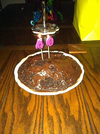 I did not want a store-bought cake this year. I wanted to bake it myself. I used the stand mixer from the forties that I inherited from my grandmother last summer to bake her chocolate cake in her cake pans, using her measuring spoons and measuring cups and in that way foil any possibility of my screwing it up. And you know what? I still screwed it up, couldn't get the damned thing out of the pan. So I plopped it all on a plate, poured the frosting over it, and stuck the candles in.