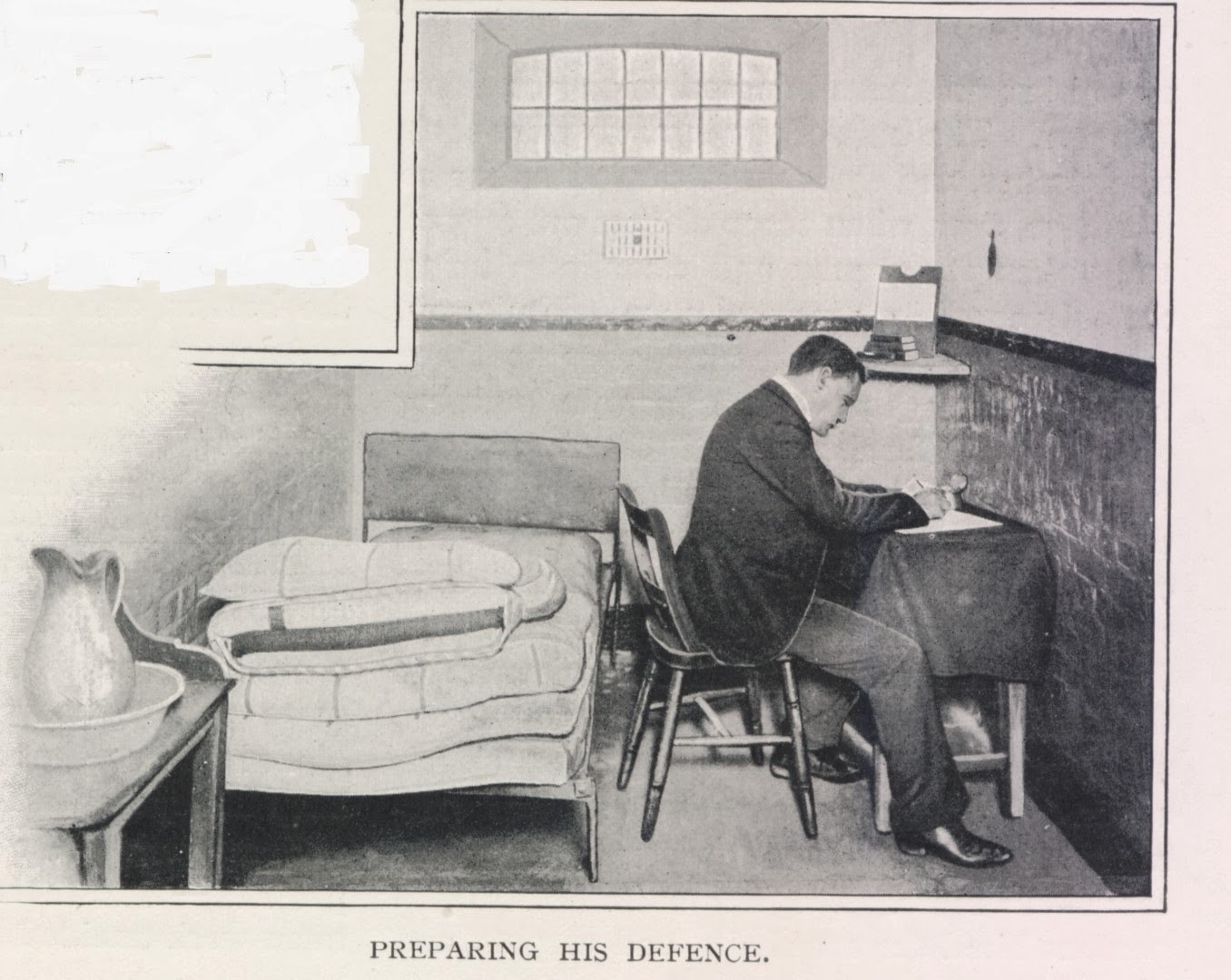 Each week, there was a similar pattern of activities in Holloway with certain hours set aside for interviews with legal advisors: 'Lawyer and client sit alone in the room specially provided, quite private as regards sound, but with a glazed side so that the warder on duty may keep his eye on all that does on. Solicitors seldom work without fees, and the penniless prisoner - once more it is money that rules - must work unaided by advice. He may have as much paper as he pleases, and can draw up any number of statements.'