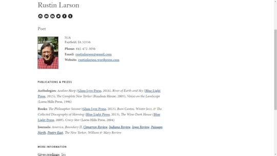 Rustin Larson’s poetry has appeared in The New Yorker, The Iowa Review, and North American Review. He won 1st Editor’s Prize from Rhino and was a prize winner in The National Poet Hunt and The Chester H. Jones Foundation contests. A graduate of the Vermont College MFA in Writing, Larson was an Iowa Poet at The Des Moines National Poetry Festival, and a featured poet at the Poetry at Round Top Festival.