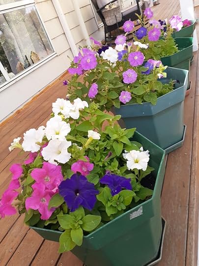 Pretty pale blue Plumbagos, petunias and Ivy leafed pelargoniums are some of the main flowers at the moment.