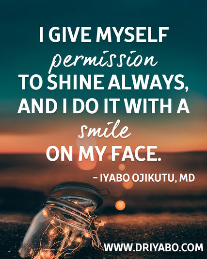 I give myself permission to shine always, and I do it with a smile on my face. Shyness is not a reason not to shine. You can be shy, yet shine when you need to.