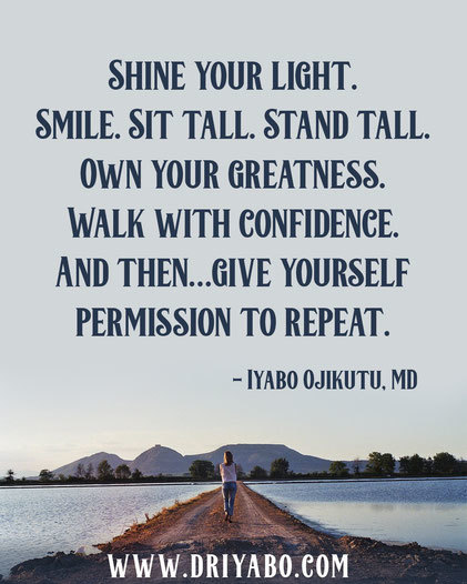Shine your light. Smile. Sit tall. Stand tall. Own your greatness. Walk with confidence. And then…give yourself permission to repeat.