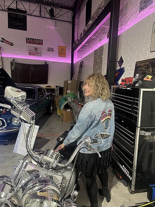 Jean jacket over a body suit combined with a multi-layered black skirt – topped off with an ancient pair of nylon boots and plenty of silver jangly jewelry (that you can’t see). Notice my close proximity to my neighbor’s Harley – beats my SUV for coolness any day!