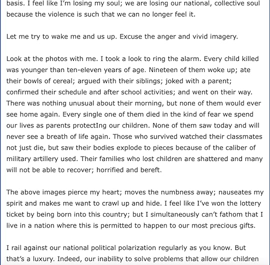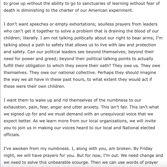 The next day, I receive the following text from a family member, who is passing this text on from a teacher who had the shooter as a student in grade school: He was very troubled even then. His parents were divorced….He was school averse. We had weekly meetings about him and with him and his family. Honestly, if you asked me to pinpoint, out of all the students I taught over 30 years, he would fit the “active mass shooter” profile the most profoundly! He was such a loner…he was so closed off…I have many vices. And one of them is binge watching – especially fast breaking news stories and enticing series. Whoa is me when I get hooked. House plants die. Texts and e mails go unanswered. Bills get paid late. And the wash piles up.