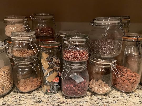 Formica gradually gave way to granite. The kids flew the nest and the canisters contents evolved yet again: a vast assortment of nuts, chia seeds, Grape Nuts cereal, brown rice and mini Kind Bars.