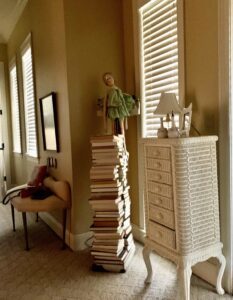 Years later working at a non-profit, I was the recipient of an old-fashioned scale the organization was getting rid of. It now holds another one of my obsessions: my stack of “books to read someday.”