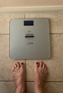 In October, I signed up for Noom – a health app that provides articles, tools and tracking for progress in weight loss. The program dictates daily weigh-ins. Hence, I had no choice but to devise a routine: Nine AM every day, before my first cup of coffee, I strip off everything – my watch, my nightgown, my hair clips – I mean everything. Except my bikini briefs. And step on the digital truth-teller.