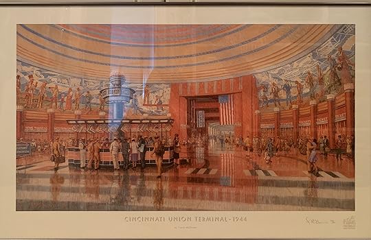 All departing soldiers from the Cincinnati, Ohio region said good bye to their families at the train station known as Union Terminal. The art deco rotunda was famous for tearful partings and joyful reunions. The couple embracing in the lower right was based on my parents – who were actually there at the exact time the artist was sketching the scene. My mother didn’t find this out until years later – through a random phone call from another soldier who had also been there that day. She was unable to share this happy coincidence with my dad, who had passed away just a few months before.