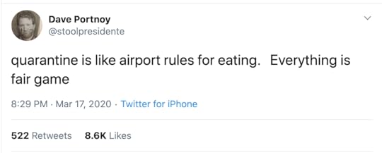I can relate. My quarantine regimen: walk 15,000 steps daily, meditate each morning, eat in moderation. Instead, I ordered in an extra-large pepperoni pizza three days in a row – rationalizing my fall from grace as supporting the restaurant industry.
