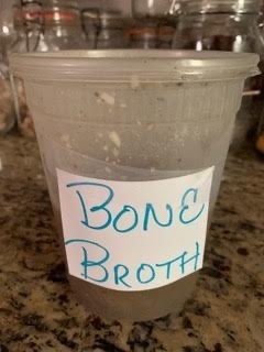 Cool broth. Strain. Make sure all marrow is knocked out of the bones and into the broth.