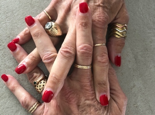 I’m seventy years old and I still wear bright red nail polish. And I still wear the same number of rings on all my fingers as I did fifty years ago: