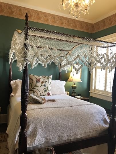 A charming private room and bath await me – with floral patterned wallpaper and a queen size bed with a canopy.