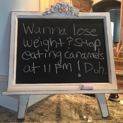 I always save it. Some I drop in bright red file folders. Some I type in my quotes folder under Notes in my iPhone. Some I snap a picture of and put in Photos. Some I scribble on whatever scrap of paper is handy and hastily stuff in my pocket. Sometimes, the washer then eats them. Sometimes they survive. And, if I need reinforcement and a kick in the tushy? I carefully print a message on my funky kitchen blackboard. Like this one below:
