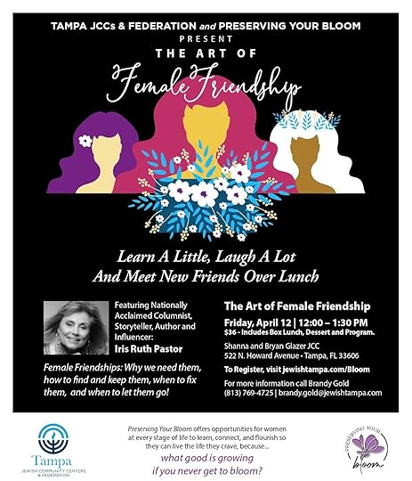 On Friday, April 12th, our very first program, ”The Art of Female Friendship”, will debut in partnership with the Tampa JCC and the Tampa Jewish Federation. (Please note this is a secular event.) Guests will have a chance to learn, laugh and meet new friends and mingle with old ones over lunch from 12:00 to 1:30 PM at the JCC at 522 N. Howard Avenue. Doors open at 11:30 AM.