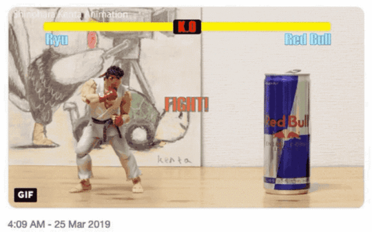 Twitter user Kenta Shinohara makes excellent stop-motion animation clips using game and anime figures. Case in point, this one of Ryu beating the crap out of a Red Bull can.
