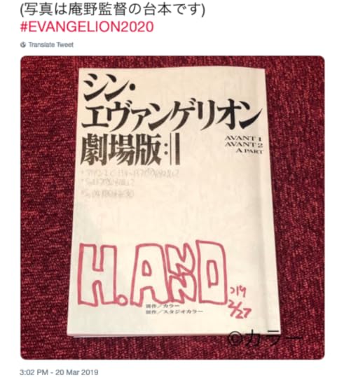 Dialogue dubbing for Evangelion: 3.0+1.0 has begun. Pictured is a copy of Evangelion creator Hideaki Anno’s script. The movie is slated for a 2020 release in Japan.