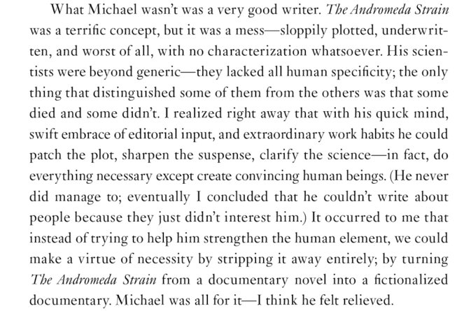 This experience of mine is the norm, not the exception. In reading I found, time and time again, how valuable editors are in crafting final drafts. There’s the famous example of Harper Lee handing in Go Set a Watchmen and her editor suggesting she rewrite the story, set in the past, from Scout’s perspective (which went on to become To Kill a Mockingbird). And I recently read this account of editing Michael Chricton (one of my early favourite authors – still love the Lost World). Read that here.