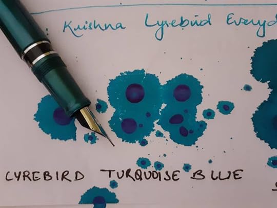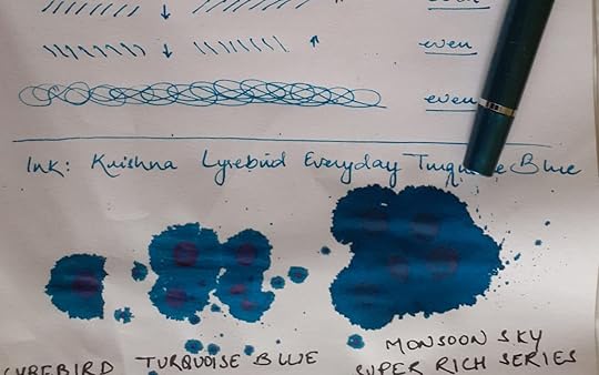 For comparison, I dropped a few drops of both colors. Turquoise, by definition, is a step or two towards green. Monsoon Sky is exactly what its name suggests. Lyrebird has better contrast, but Monsoon Sky spreads better. Also, the base tone of Monsoon Sky, I found, to be toward a much lighter shade of blue.