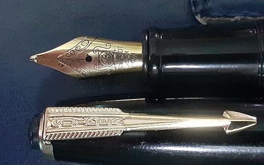 The feed is plastic. And until you reach the break-in stage for this pen, which should be as early as a couple refills, the pen will tend to skip a bit. But then it could also be because of the combination of the thirsty Broad nib, the plastic feed, and the quick-drying Parker Quink.