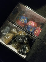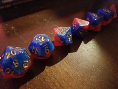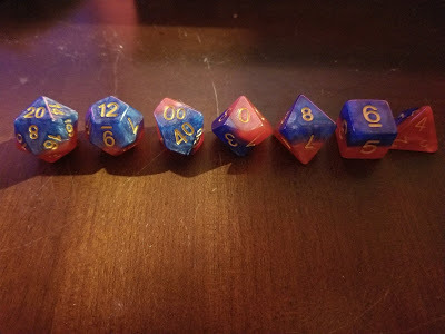 Forever ago, Matt kickstarted the Halfsies dice campaign. We were able to pick up four sets of dice and I got the Superdice (blue and red) and the Davinci dice (black and gold). We just got them in the mail today, but I had a D&D game tonight so I was able to put my new Superdice to use on my earth genasi bard, Ariyaris. That's it. I just want to show of my new dice and say how well they did for me out of the box. Ari rolled two nat 20s tonight and at least one nat 12 for damage. So they're off to a good start.My Davinci dice might turn into my GM dice for the game I run on Wednesdays, as long as the cats don't bother me. They didn't seem to care for them tonight, but they almost always want to be on my desk when I'm surrounded by dice, books and notes.
