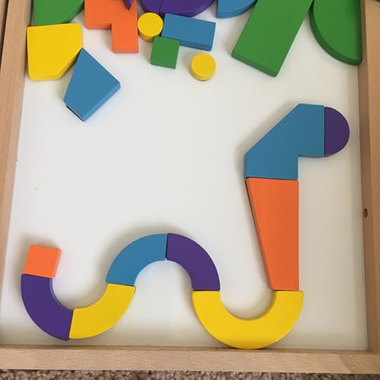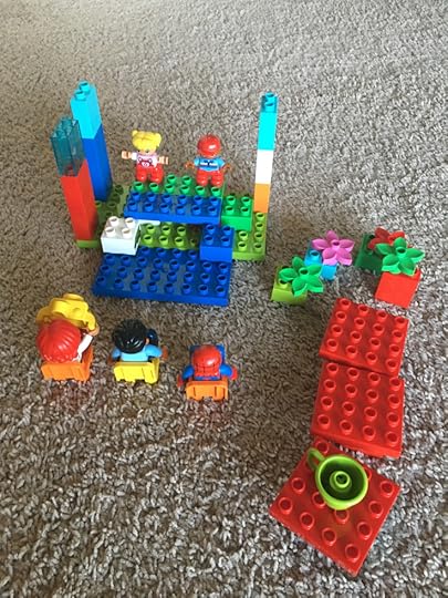 T made this adorable stage and a full blown story where the little figurines have a school program, complete with parents taking pictures. While not evident, some blocks are steps to the stage which is why there is no fourth pillar!