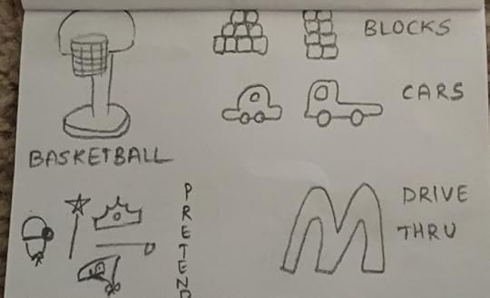 Enter the Choice Activity book. T loves coloring. So , we both colored on these little pages from a Dollar tree notepad. While she made her favorite items, I drew thirty activities with her playthings that she could choose from. A la restaurant menu.