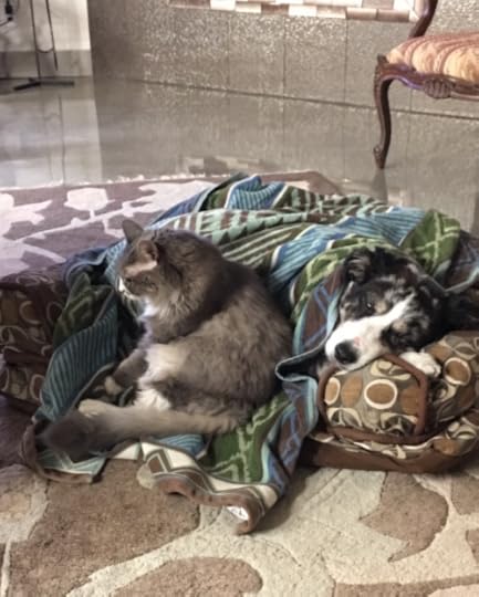 • In late August our 10-year-old Australian Shepherd Lucy came through some sudden and very delicate surgery on her neck. Her spinal cord was severely kinked between two of her cervical vertebrae, probably the result of a kink in her genes. Frankly, she made it off the operating table only because her veterinary neurosurgeon has steady hands and thirty-five years’ experience with complex procedures. So far her recovery is progressing as expected. Here she is the day after I brought her home, still groggy from the pain meds and about to be smothered in her bed by Phoebe.