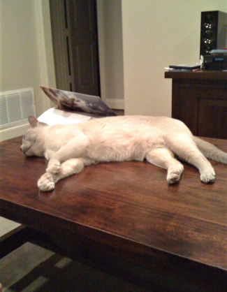 The last straw for Katie came one morning when she walked into the kitchen and saw something I’d sworn I would never allow: Phoebe stretched out on the kitchen table while I ate breakfast. (Yes, Tsuki has been on Katie’s table many times, but apparently not during meals. So how is this different?)