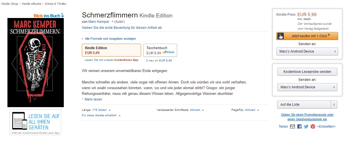 Schmerzflimmern ist nun auch für die Freunde digitaler Lesekost verfügbar. Für die ersten zwei Wochen, habe ich mir sogar einen winzigen Spar-Deal überlegt. In den ersten zwei Wochen (ab jetzt!), kostet die Kindle Edition zum Beispiel bei Amazon nur 5,99€ - an...