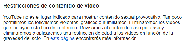 YouTube no es el lugar indicado para mostrar contenido sexual provocativo. Tampoco permitimos los fetichismos violentos, gráficos o humillantes...Youtube ha eliminado un vídeo de mi canal. Bueno, ya van unos cuantos. Basta con que salga alguien desnudo, aunque no se le vea ninguna parte íntima, para que actúe la tijera de la censura. Luego matizaré que esto no es exactamente así ya que hay vídeos de todo tipo publicados en youtube, la mayoría más fuertes que los míos, que encima son super sutiles. Lógicamente, los más vistos eran los borrados, por ser un poco más explícitos, como el de Amantes femdom, Femdom tántrico, o este último de My normal, en el que, oh qué “terrible”, una chica ponía su pie en la cara de un hombre arrodillado. Esa película se podía ver en cualquier cine, no es porno, ni siquiera erotismo.