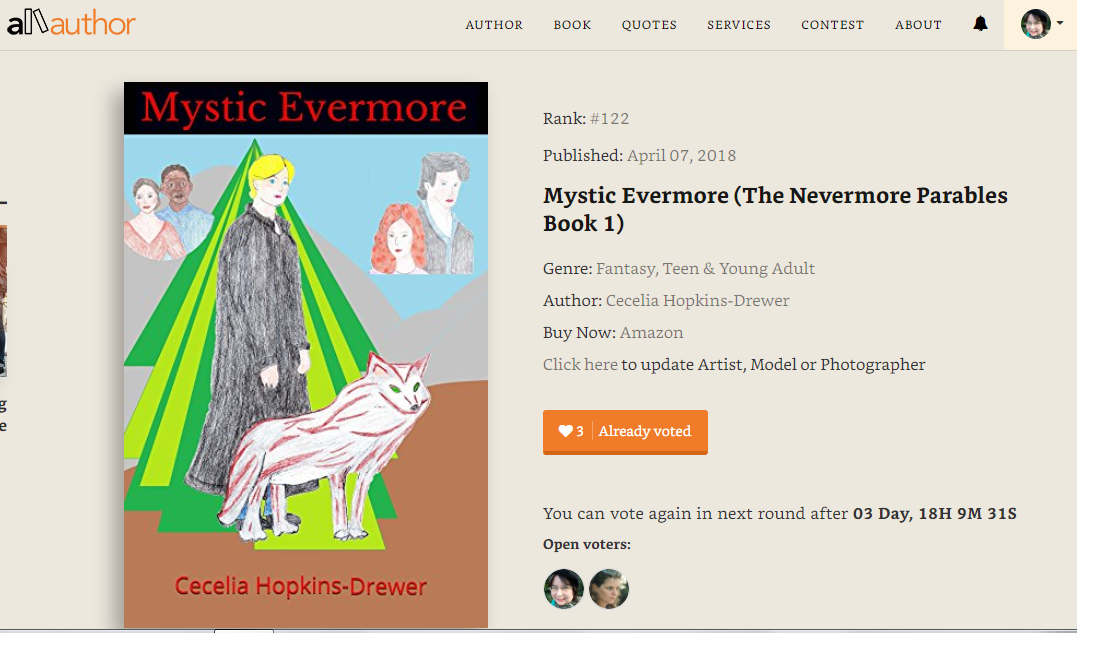 Mystic Evermore (The Nevermore Parables Book 1)My book has been nominated for Book Cover of the Month on AllAuthor.com. It would be greatly appreciated if you could take a moment to vote.