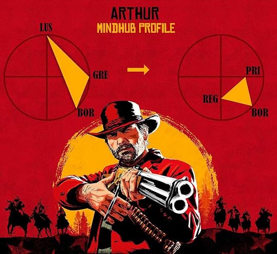 member of the Van der Linde gang and the player’s avatar for the majority of the story. Arthur is an outlaw trying to find his own path in a changing world. He is a simple man, led by his loyalties. In the first part of the game, one of his primary MindHub drives is Boredom, because he engages in almost all of the gang’s activities, even when he has doubts about them. In MindHub boredom is defined as taking part in too many activities or doing things just because there is nothing better to do. Arthur, for the most part, gives his agency to the will of the group and especially to Dutch, the group’s leader and going along with any schemes. He is also having primary Greed, as he engages in a lot of the activities because of the bounty related to them and shows his love for money. Finally, Arthur also has Lust as he likes