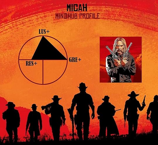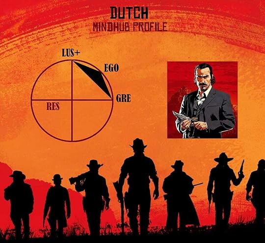 through the mouths of other characters, that he has killed an innocent person and when Dutch is speaking about it he deems it an act of revenge. Contrary to expectation, Dutch is not having primary Revenge drive. In MindHub Revenge means a willingness to carry out a proportional response to aggression, but Dutch goes further. In fact, Dutch saying things about himself which are not accurate to his actual behaviors is evident throughout the story. So what drives does Dutch actually portray? He clearly loves money and he wants more of it. He has primary Greed in the Mindhub system. Unsurprisingly, for the leader of a gang, he also has primary Ego, he wants to be recognized and respected as a visionary and idolized. However, the most prevalent of his drives is Lust, which he has to an extreme degree. Lust in the Mindhub system is about enjoying destructive activity, but in the extreme it becomes carelessness and apathy regarding the consequences of ones’ actions. Interestingly enough, the man who always says “I have a plan” does not actually care about what happens after any given heist as long as the money comes in. This becomes increasingly obvious to the gang members later in the game. Dutch’s character arch is controversial and many players find it complex or baffling. Even the characters in the game are saying that something happened to him that they don’t quite understand or like. But, if we see his drives from the beginning, his arch makes sense. His profile is quite fixed and unchanging but Dutch has such a charismatic presence and way with words that the gang and most players don’t see his real personality until the actual results of the group’s actions are manifest. The other characters see it clearly only when he deserts them during missions where they might have been injured or killed. Dutch really believes he has revenge, but his disappointments particularly after the Guarma fiasco and Hosea’s death, reveal developing Resentment drive instead. The gang members comment that he is enjoying hurting people and in a way that is out of proportion to the situation. Dutch is the provocateur then the executor, strangling the Italian and the old woman, and killing Cornwall on a “social call”. When Dutch is confronted about anything related to his character or lifestyle he doubles down; he speaks like a preacher who worships the idea of the life of the outlaw as a utopian model, and he justifies killing as a necessary