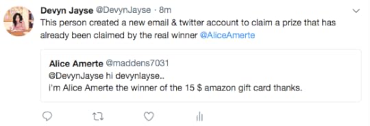 A person contacted me claiming to be the winner of a giveaway. What they didn’t know is that the actual winner had already reached out and claimed her prize. I had linked to the winner’s twitter account in the December Giveaway Winners post and so I requested that they tweet me from it. I wanted to see how far they’d go to claim a $15 Amazon gift card that they hadn’t won. They tweeted back, but not from the linked account. It was a different one but using the same profile photo the real account had.