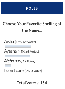 All it took was one vote to choose Aisha as the preferred spelling of the name, beating Ayesha. There wasn’t much love for the Aicha spelling, only 11% voted for it.