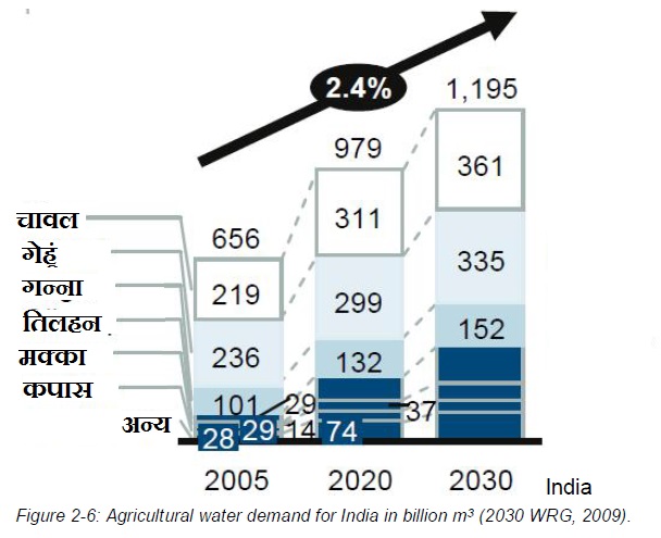 जाहिर है इस बढ़ी आबादी को खाने के लिए अनाज चाहिए होगा, नहाने और धोने के लिए पानी चाहिए होगा. अनाज उगाने के लिए पानी भी मौजूदा संसाधनों से ही खींचा जाएगा. असल में, पानी की मांग आबादी में बढोतरी के साथ उपभोक्ता मांग और विश्व बाजार के विकास से भी होता है.